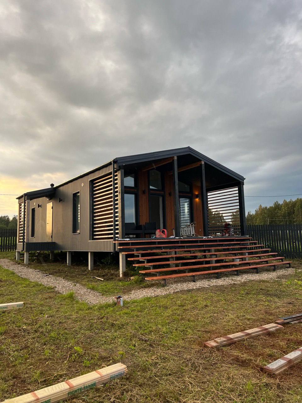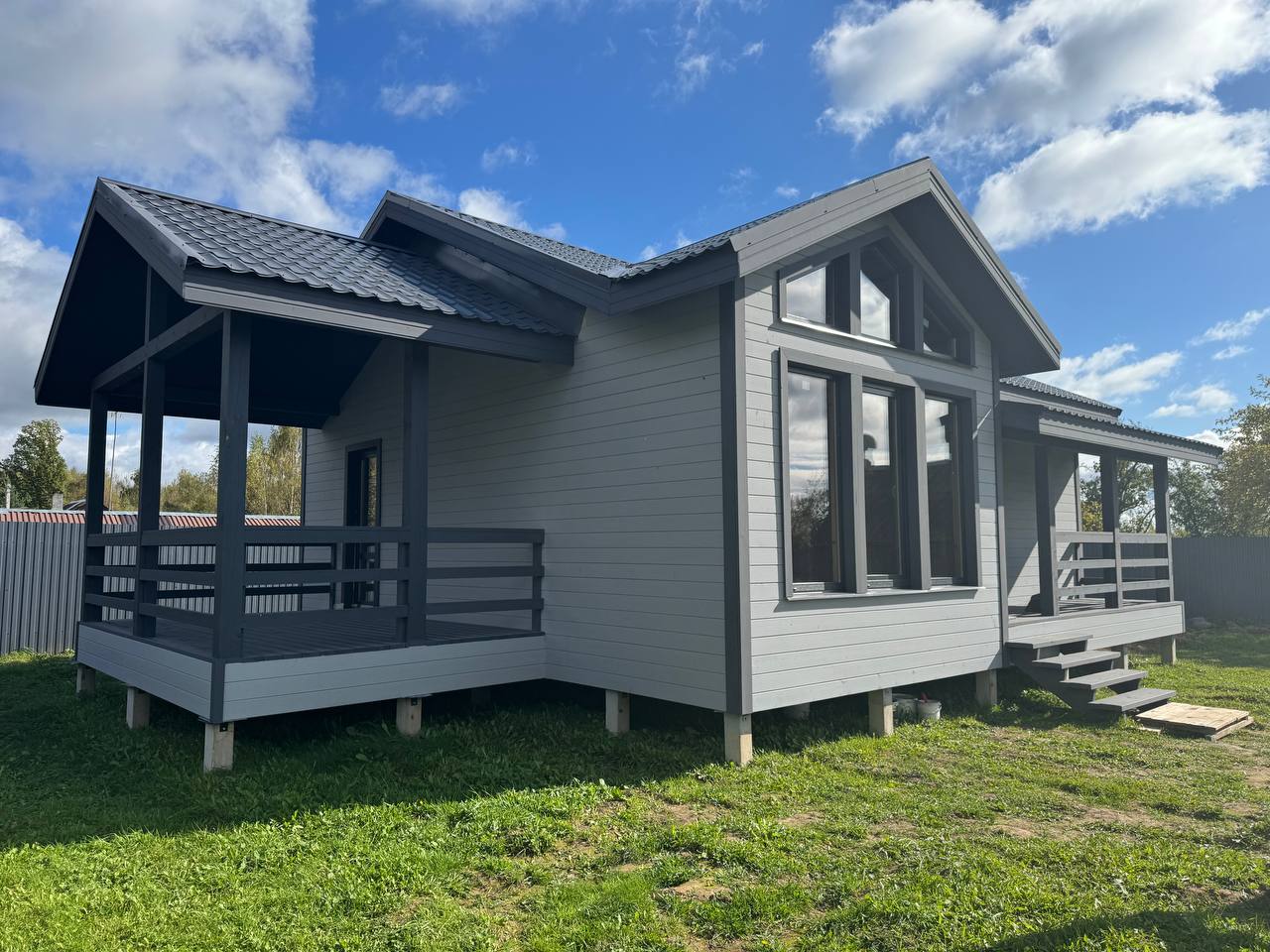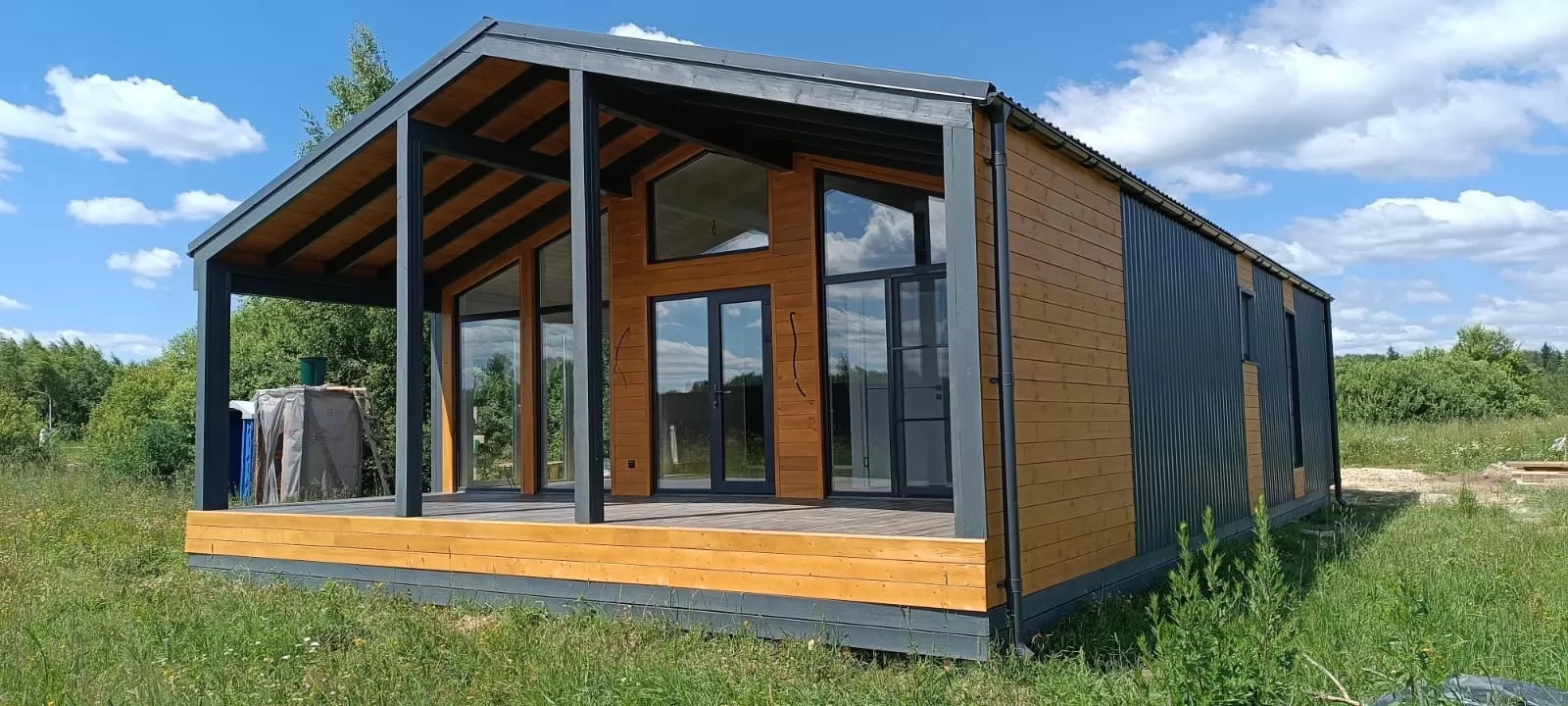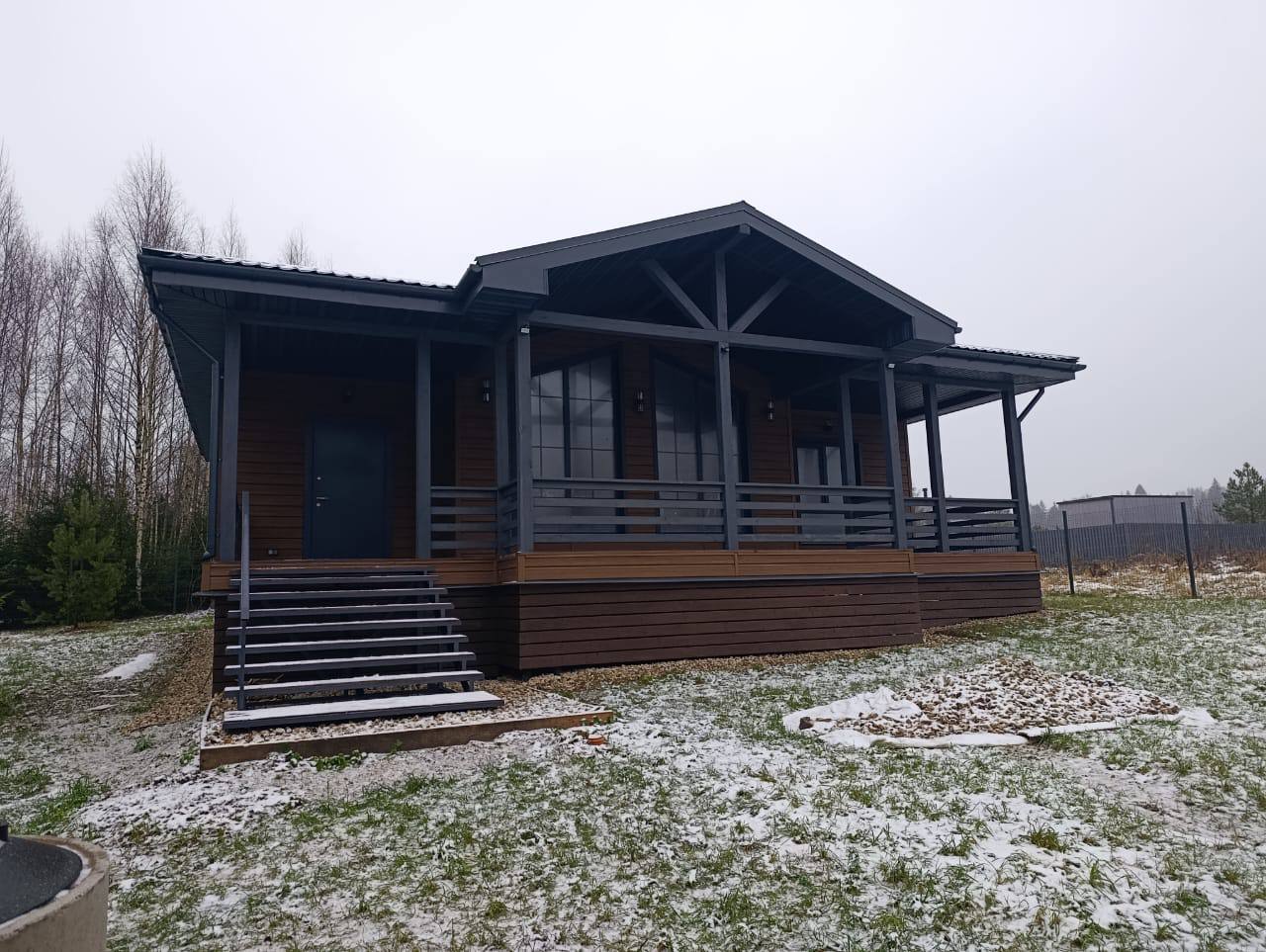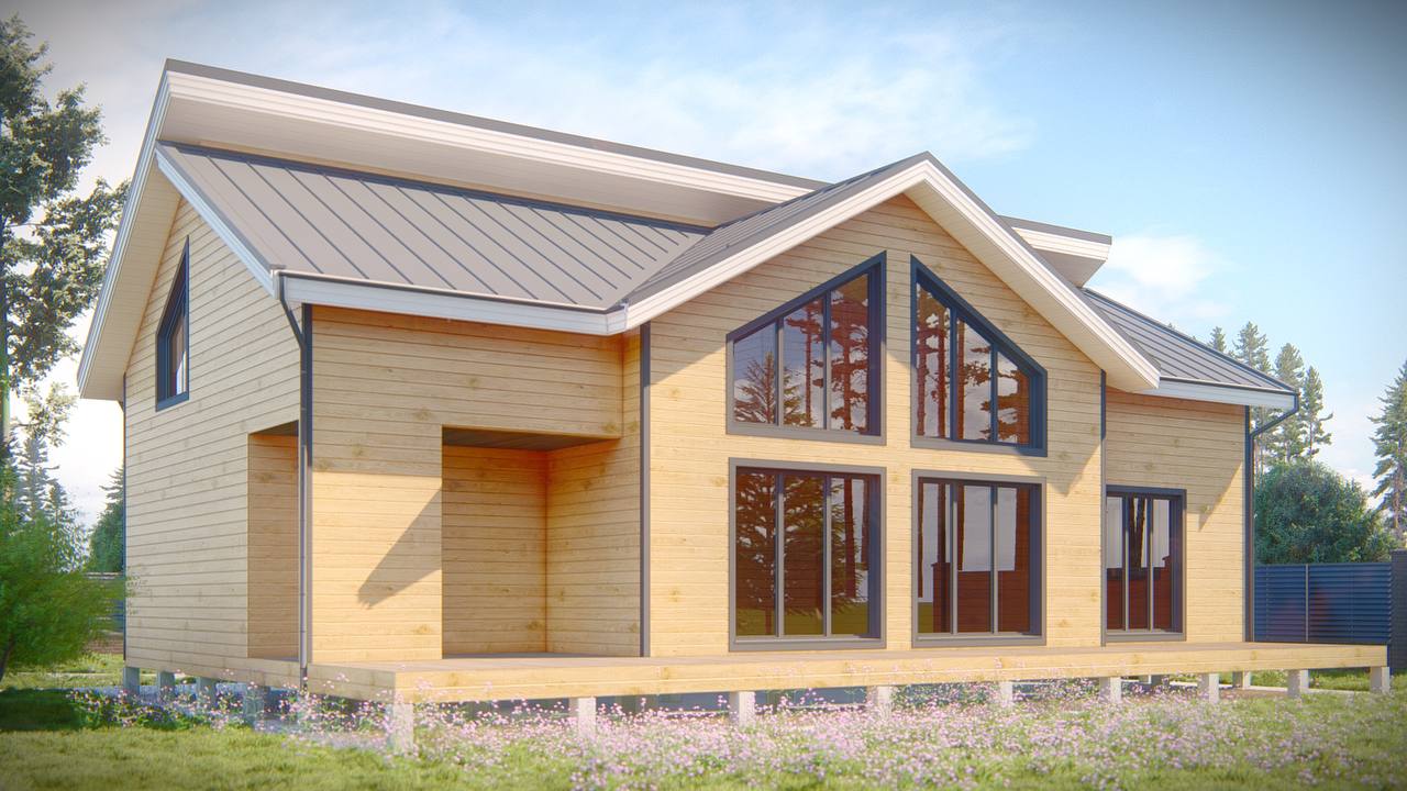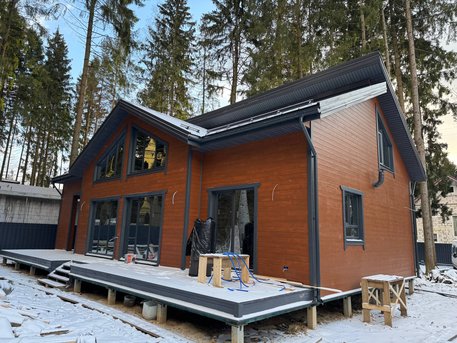 Современный двухэтажный дом с большими окнами, покатой темно-коричневой крышей, акцентами из дерева и камня и крытым крыльцом — идеальный пример каркасного дома в Московской области, окруженного деревьями и зеленью. Современный деревянный дом, построенный в стиле дома из клееного бруса, с большими окнами и темно-серой крышей стоит на травянистом участке. Небо пасмурное, на заднем плане видны соседние дома и деревья. Современный светло-коричневый деревянный дом с серой крышей и большим крытым крыльцом стоит на травянистой земле под частично пасмурным небом — отличный пример каркасных домов в Московской области. На заднем плане видны деревья и еще один дом. Современный двухэтажный каркасный дом с крутой двускатной крышей, большими окнами и крыльцом, возвышающийся на сваях, окруженный травой и частично пасмурным небом.