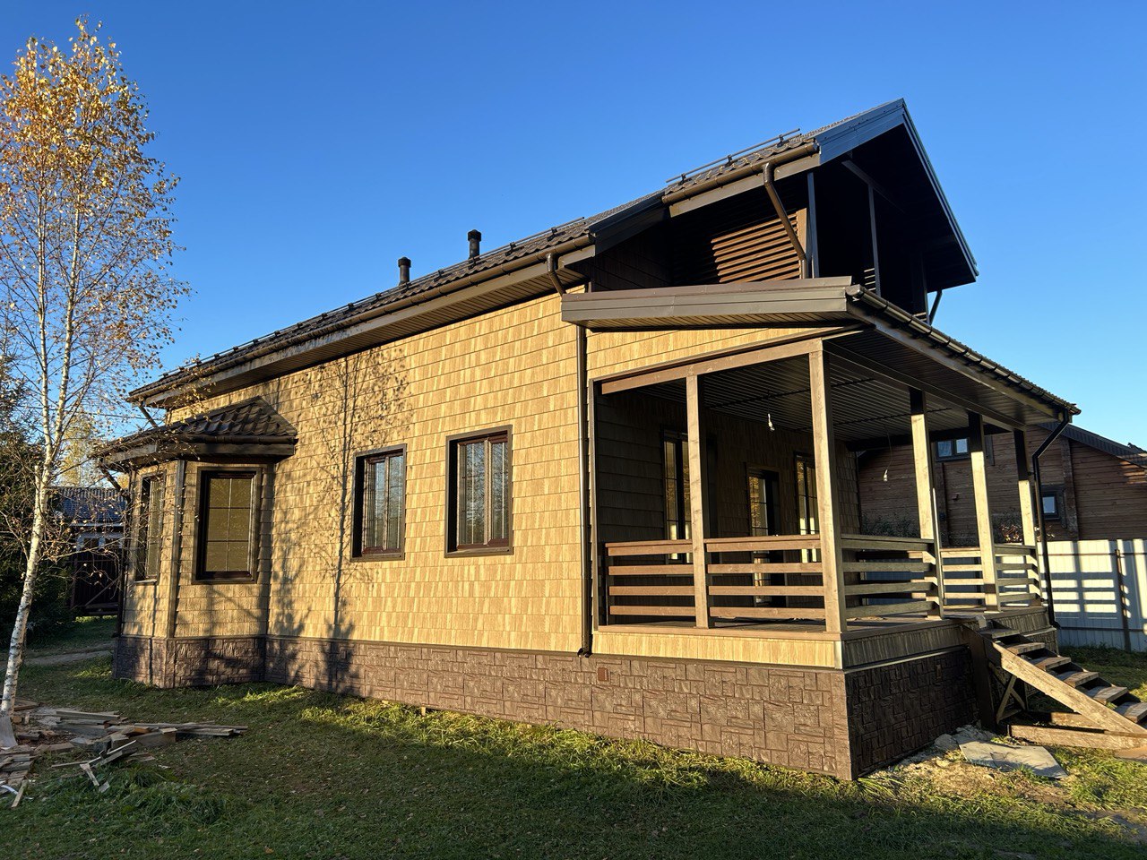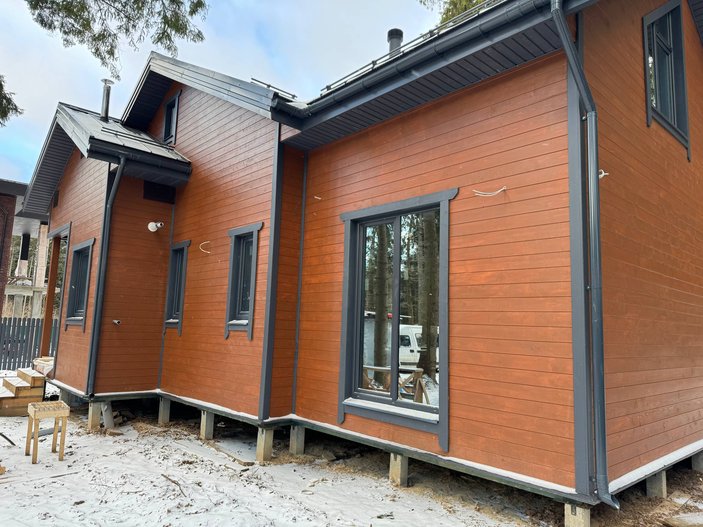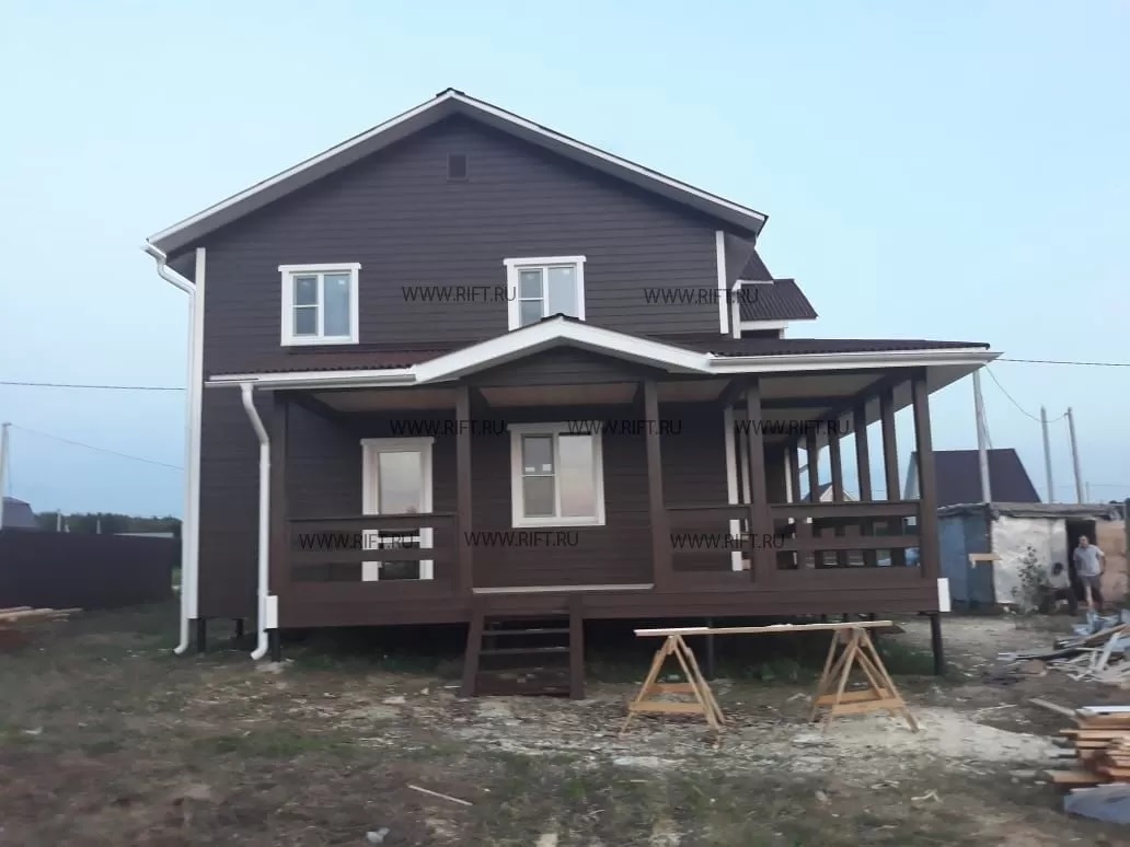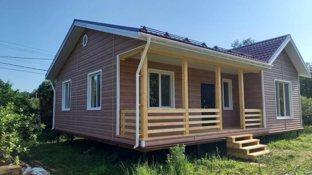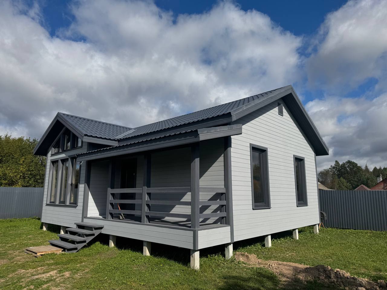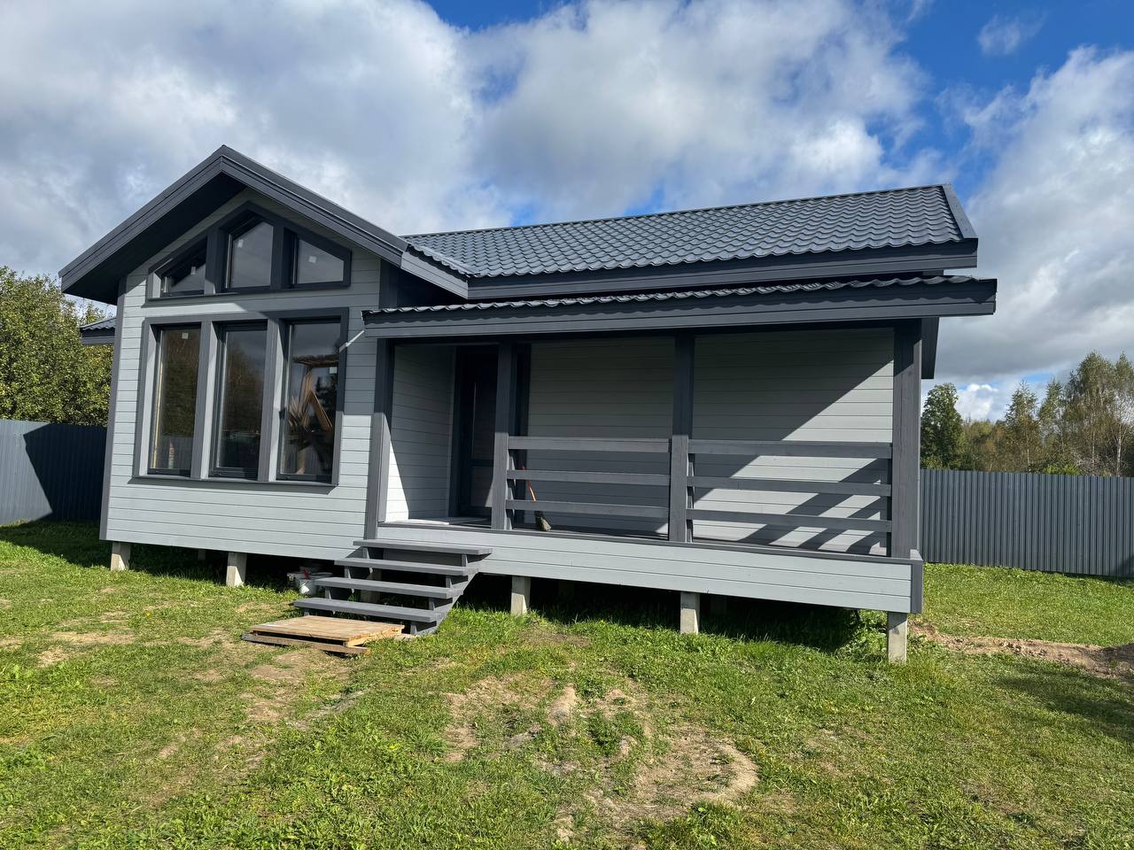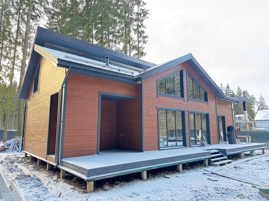Современный двухэтажный дом с большими окнами, покатой темно-коричневой крышей, акцентами из дерева и камня и крытым крыльцом — идеальный пример каркасного дома в Московской области, окруженного деревьями и зеленью. Современный деревянный дом, построенный в стиле дома из клееного бруса, с большими окнами и темно-серой крышей стоит на травянистом участке. Небо пасмурное, на заднем плане видны соседние дома и деревья. Современный светло-коричневый деревянный дом с серой крышей и большим крытым крыльцом стоит на травянистой земле под частично пасмурным небом — отличный пример каркасных домов в Московской области. На заднем плане видны деревья и еще один дом. Современный двухэтажный каркасный дом с крутой двускатной крышей, большими окнами и крыльцом, возвышающийся на сваях, окруженный травой и частично пасмурным небом.