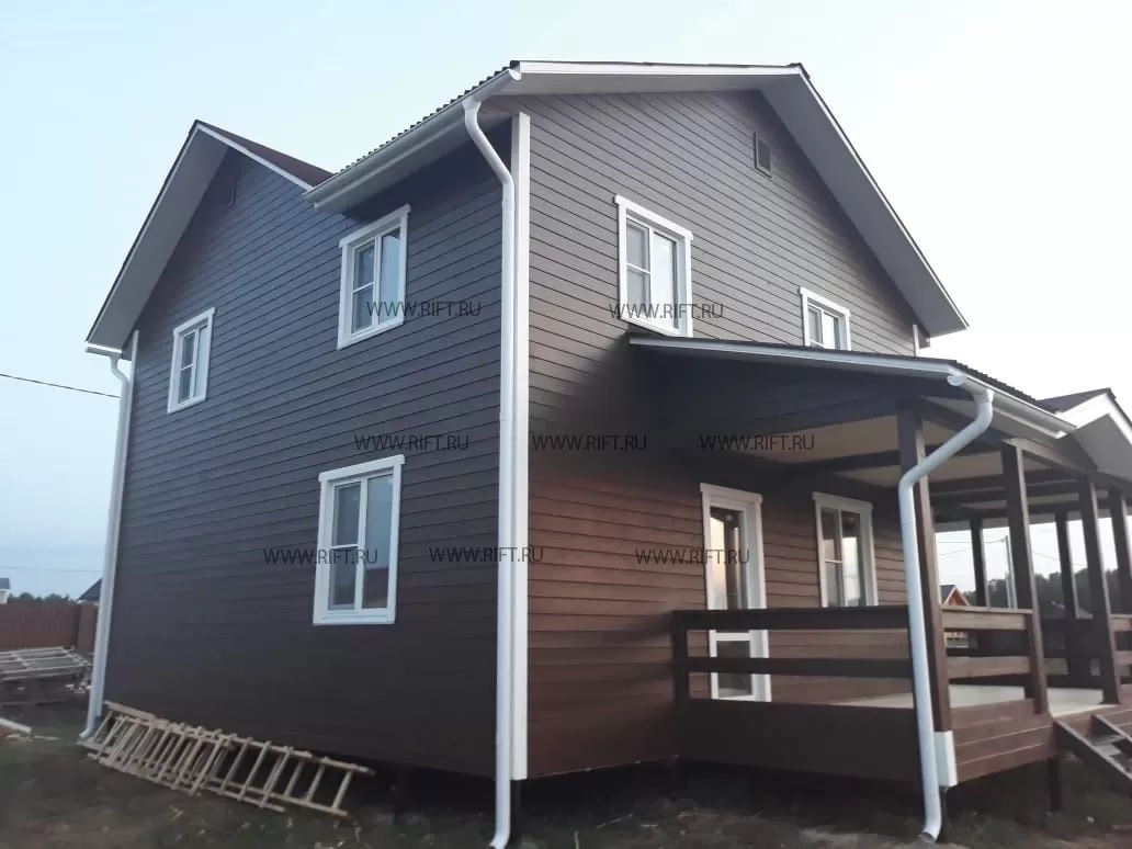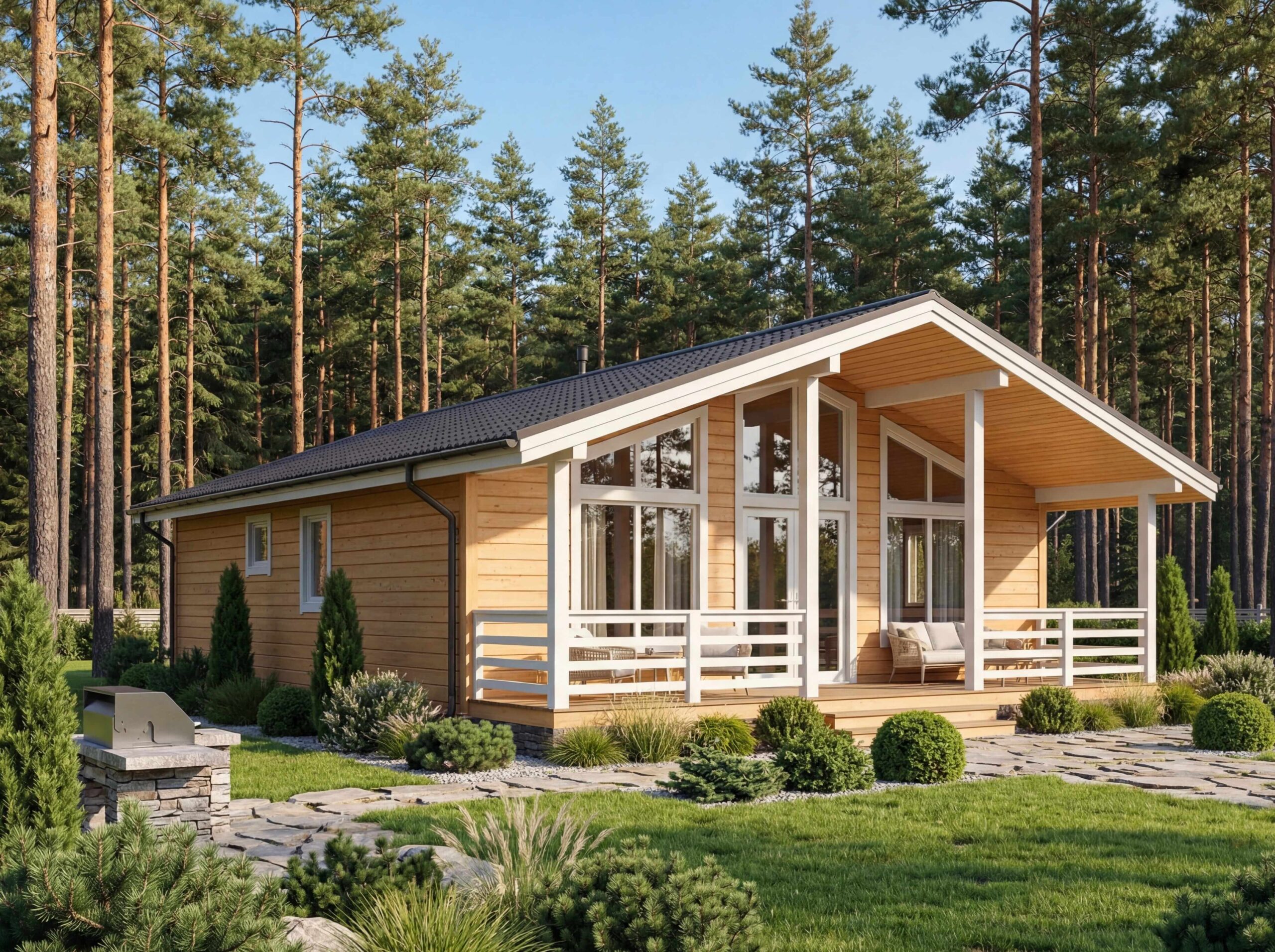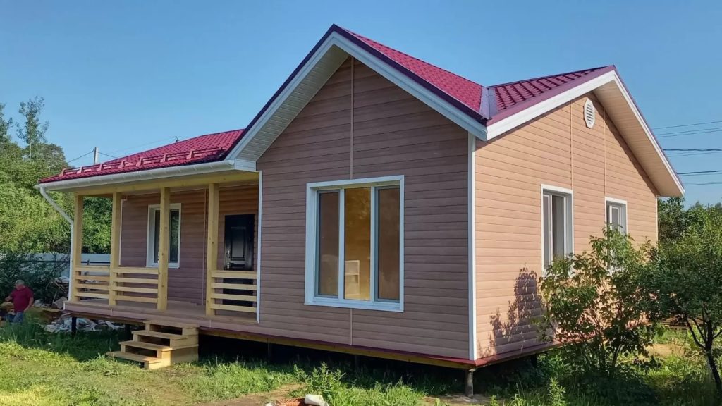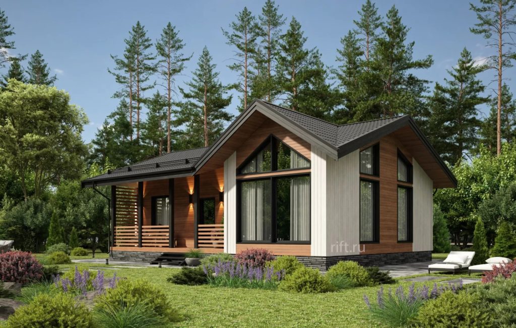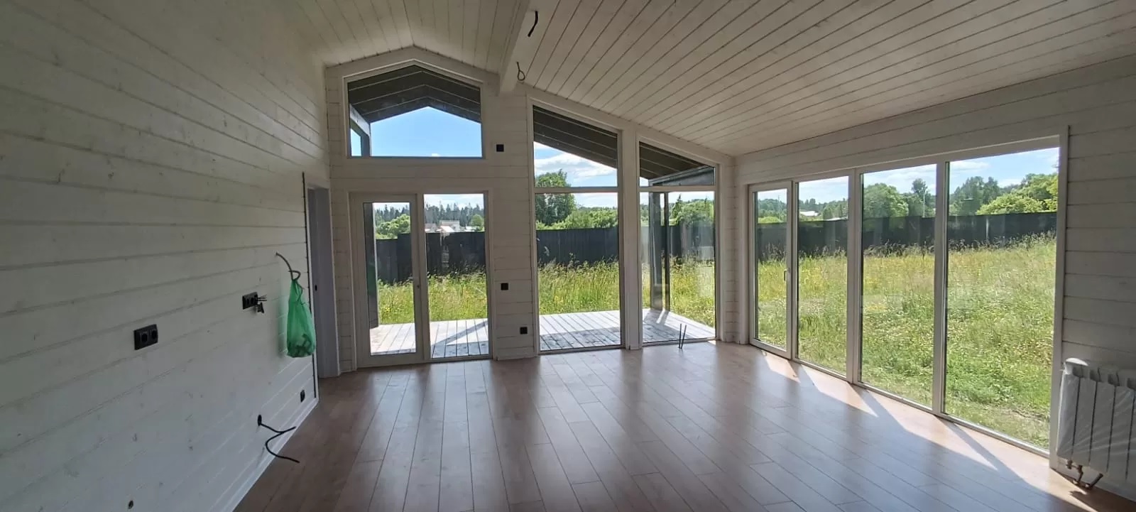 Современный двухэтажный дом с большими окнами, покатой темно-коричневой крышей, акцентами из дерева и камня и крытым крыльцом — идеальный пример каркасного дома в Московской области, окруженного деревьями и зеленью. Современный деревянный дом, построенный в стиле дома из клееного бруса, с большими окнами и темно-серой крышей стоит на травянистом участке. Небо пасмурное, на заднем плане видны соседние дома и деревья. Современный светло-коричневый деревянный дом с серой крышей и большим крытым крыльцом стоит на травянистой земле под частично пасмурным небом — отличный пример каркасных домов в Московской области. На заднем плане видны деревья и еще один дом. Современный двухэтажный каркасный дом с крутой двускатной крышей, большими окнами и крыльцом, возвышающийся на сваях, окруженный травой и частично пасмурным небом.