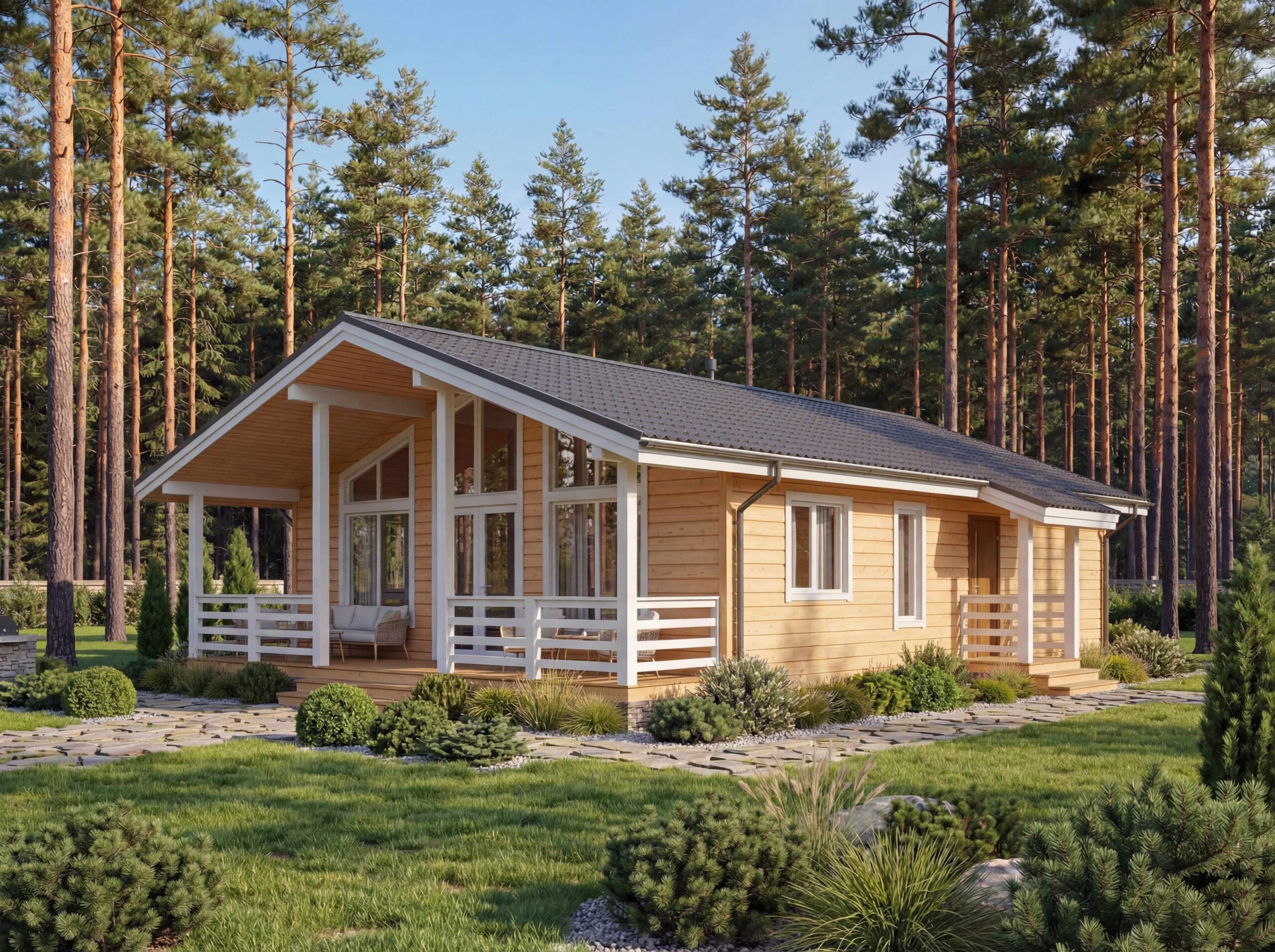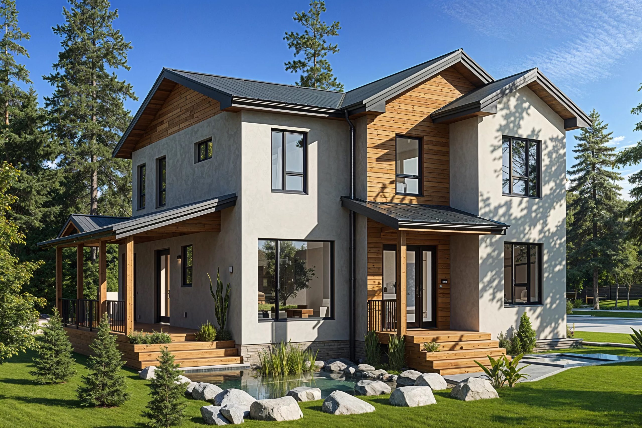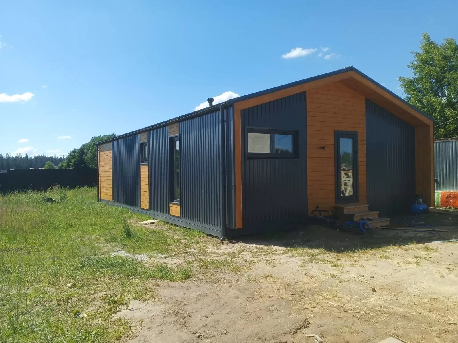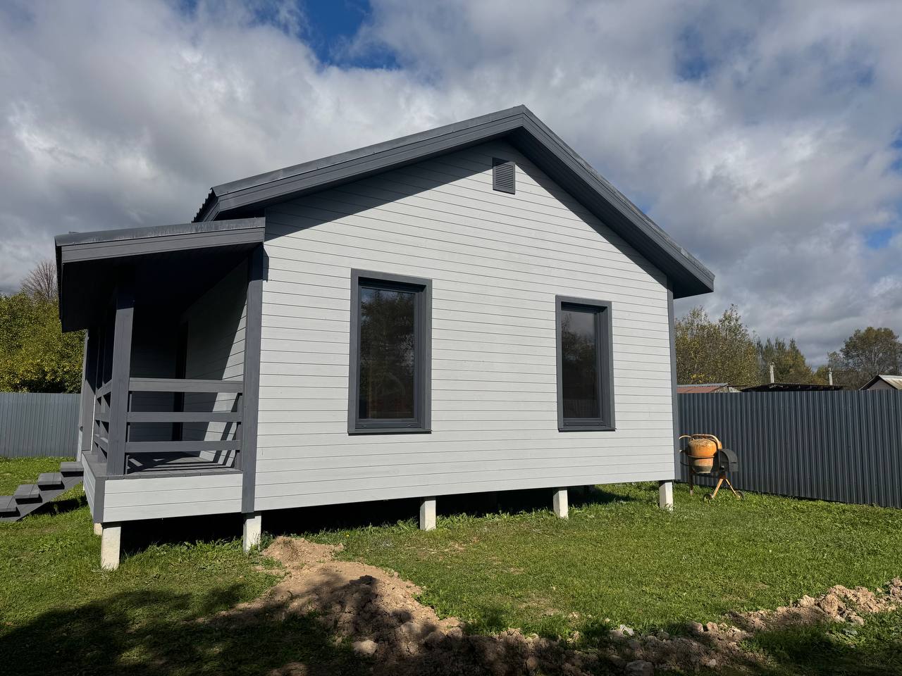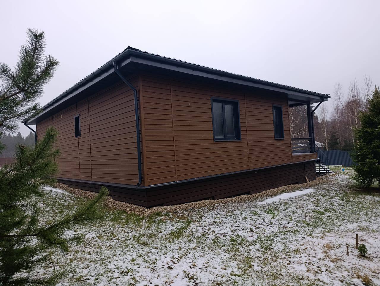 Современный двухэтажный дом с большими окнами, покатой темно-коричневой крышей, акцентами из дерева и камня и крытым крыльцом — идеальный пример каркасного дома в Московской области, окруженного деревьями и зеленью. Современный деревянный дом, построенный в стиле дома из клееного бруса, с большими окнами и темно-серой крышей стоит на травянистом участке. Небо пасмурное, на заднем плане видны соседние дома и деревья. Современный светло-коричневый деревянный дом с серой крышей и большим крытым крыльцом стоит на травянистой земле под частично пасмурным небом — отличный пример каркасных домов в Московской области. На заднем плане видны деревья и еще один дом. Современный двухэтажный каркасный дом с крутой двускатной крышей, большими окнами и крыльцом, возвышающийся на сваях, окруженный травой и частично пасмурным небом.