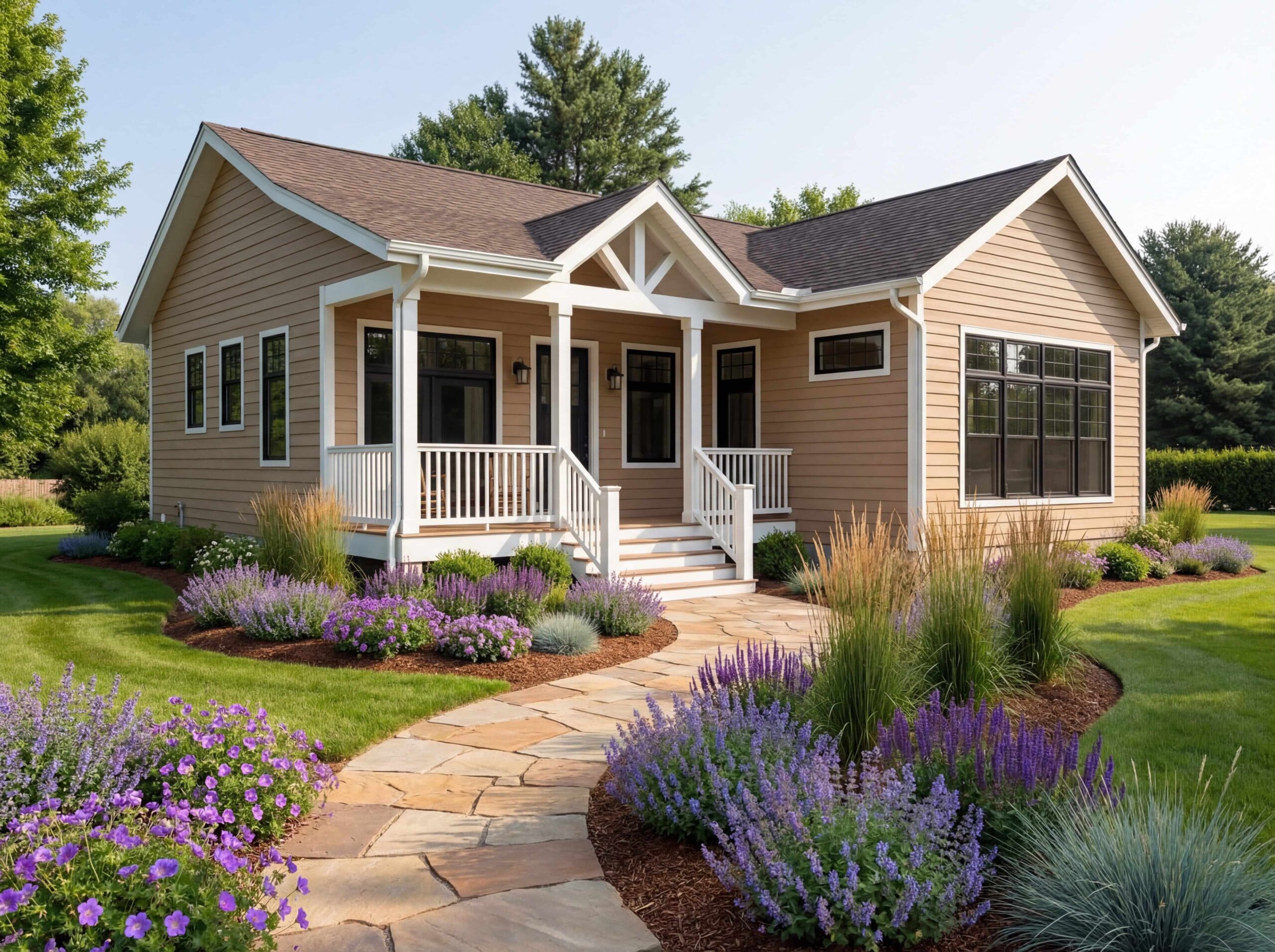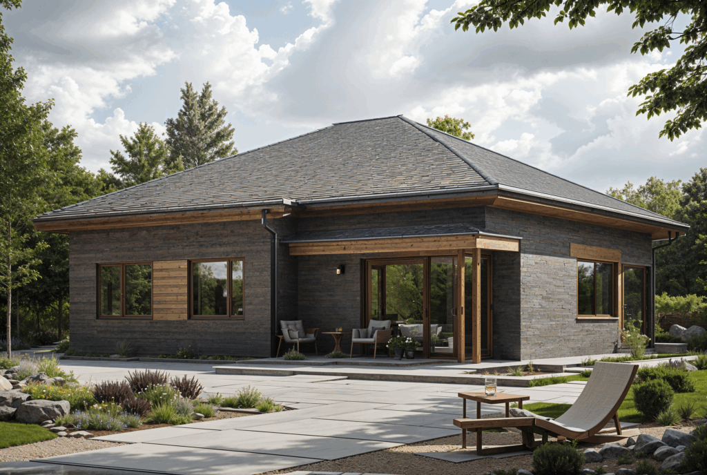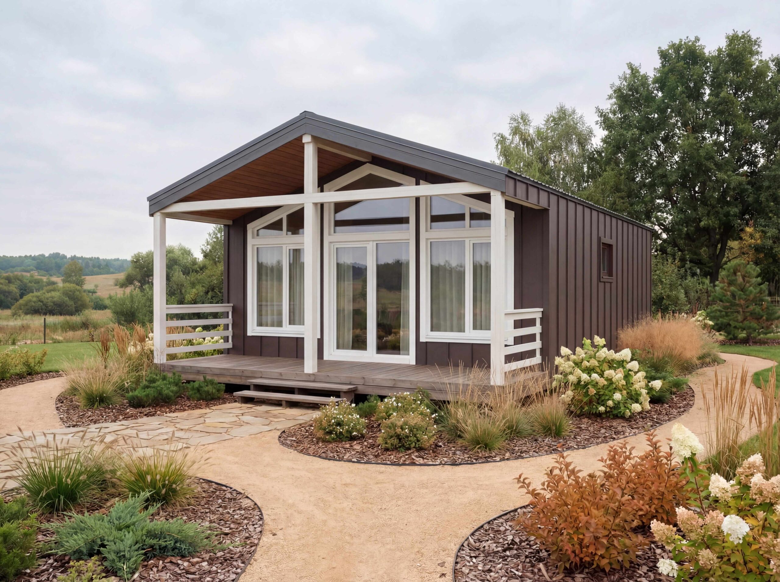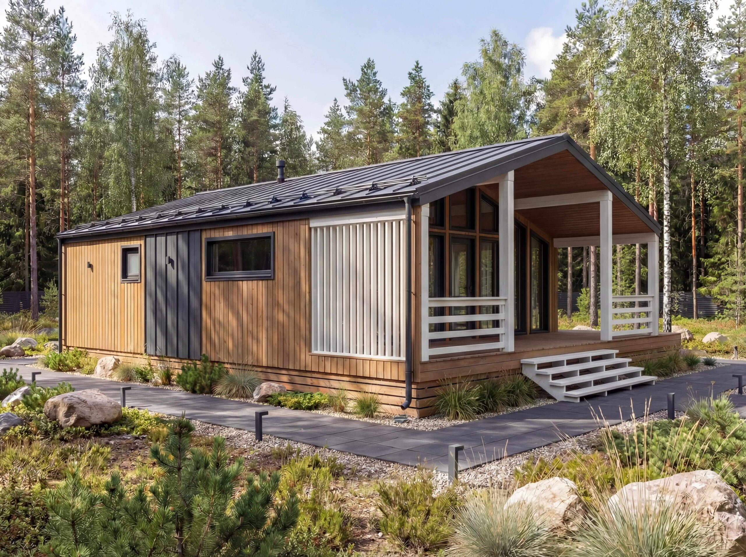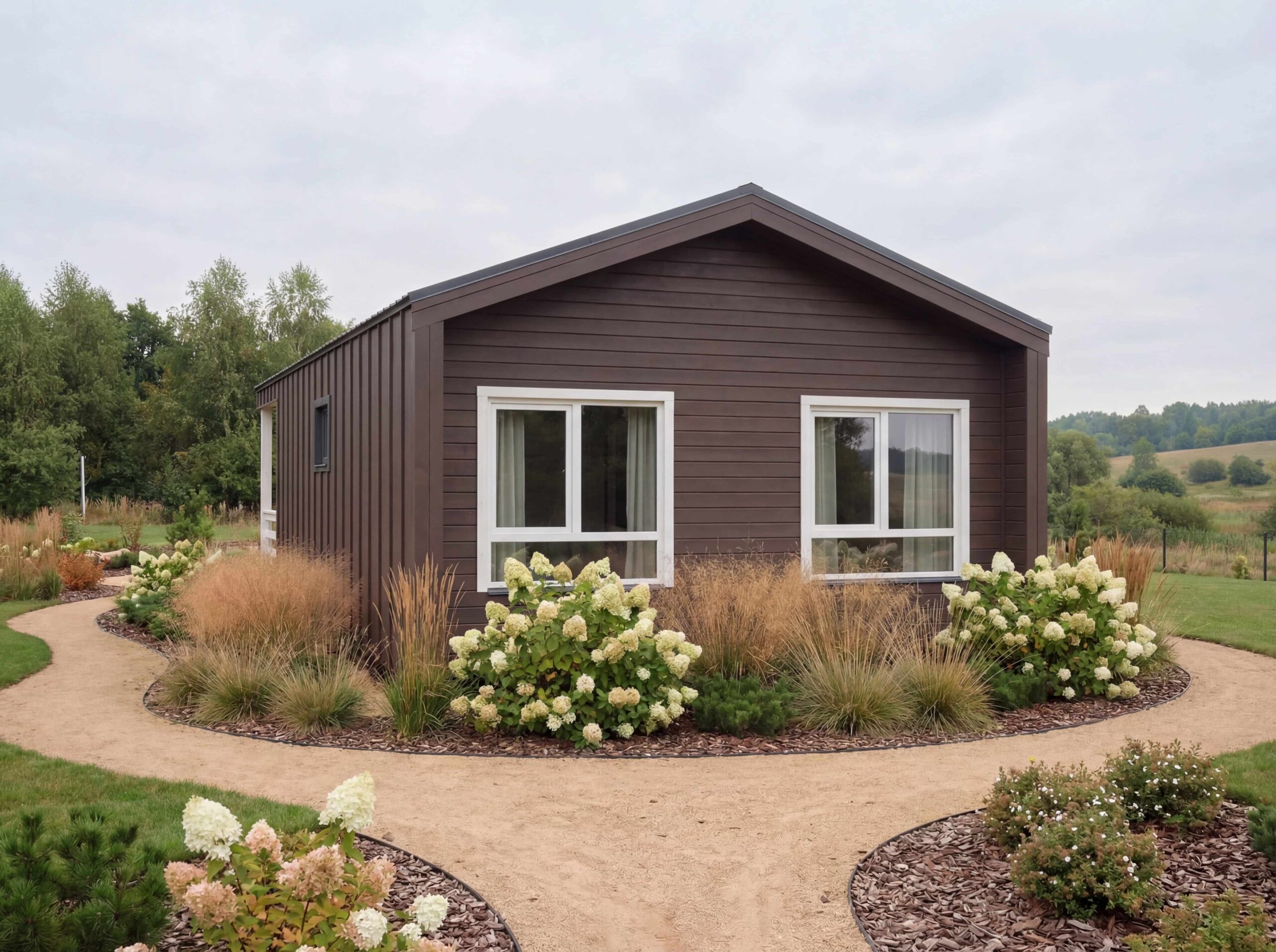 Современный двухэтажный дом с большими окнами, покатой темно-коричневой крышей, акцентами из дерева и камня и крытым крыльцом — идеальный пример каркасного дома в Московской области, окруженного деревьями и зеленью. Современный деревянный дом, построенный в стиле дома из клееного бруса, с большими окнами и темно-серой крышей стоит на травянистом участке. Небо пасмурное, на заднем плане видны соседние дома и деревья. Современный светло-коричневый деревянный дом с серой крышей и большим крытым крыльцом стоит на травянистой земле под частично пасмурным небом — отличный пример каркасных домов в Московской области. На заднем плане видны деревья и еще один дом. Современный двухэтажный каркасный дом с крутой двускатной крышей, большими окнами и крыльцом, возвышающийся на сваях, окруженный травой и частично пасмурным небом.