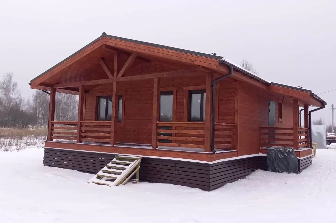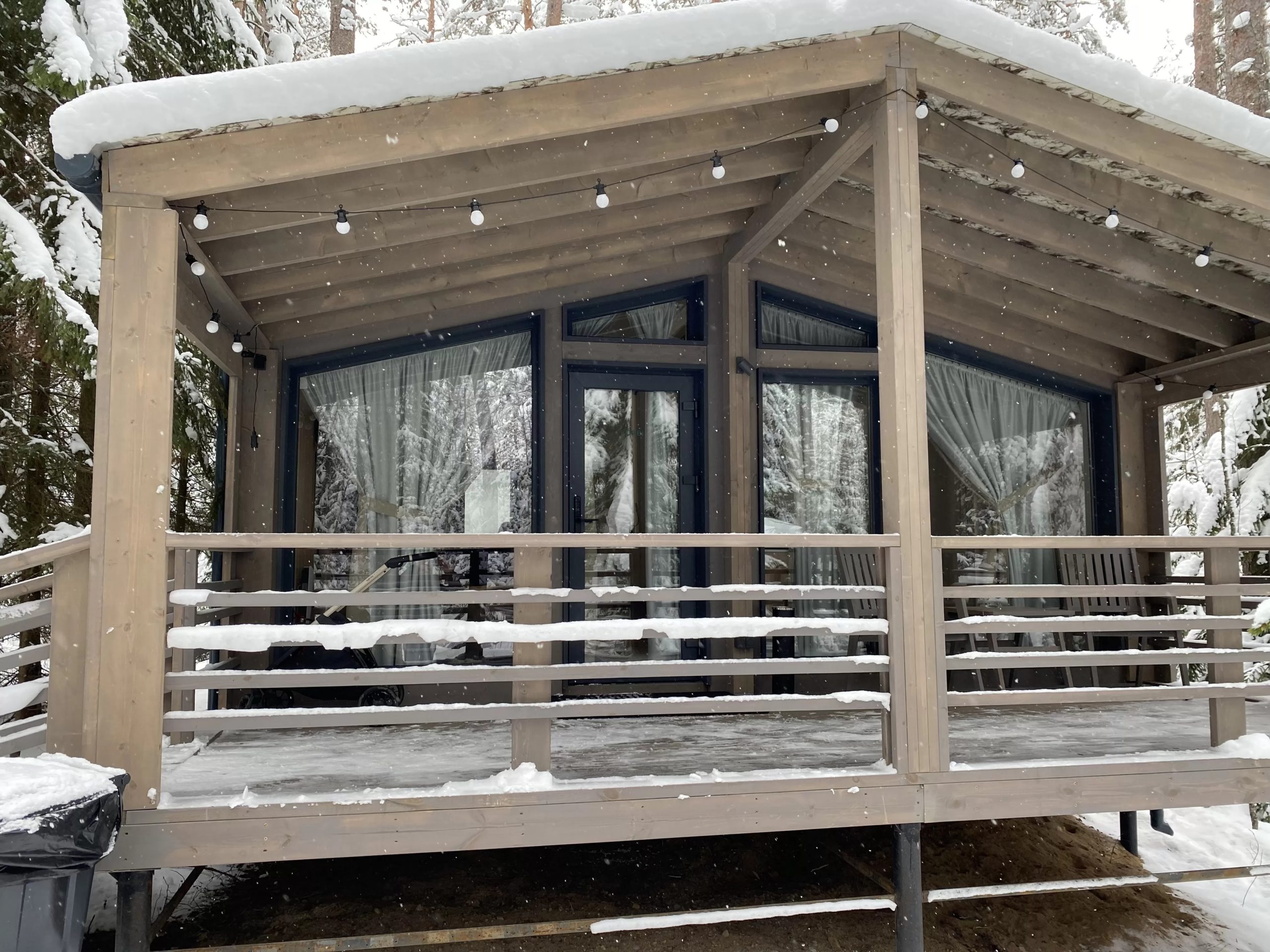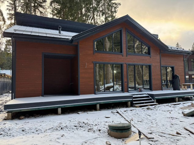 IMG 0199 IMG 0190 Деревянный домик, вдохновленный домом из клееного бруса, с большими стеклянными окнами и крытым крыльцом стоит в заснеженном лесу. С крыши свисают гирлянды, снег покрывает перила и землю в окружении высоких деревьев. Современный каркасный дом с большими окнами и крытым крыльцом расположился среди высоких сосен в заснеженном подмосковном лесу, создавая умиротворяющую зимнюю картину. Современный небольшой дом с большими стеклянными окнами, черным металлическим и деревянным сайдингом и крытым крыльцом с белыми перилами — идеальный пример каркасного дома в Московской области, расположенного в пышном, зеленом лесу.