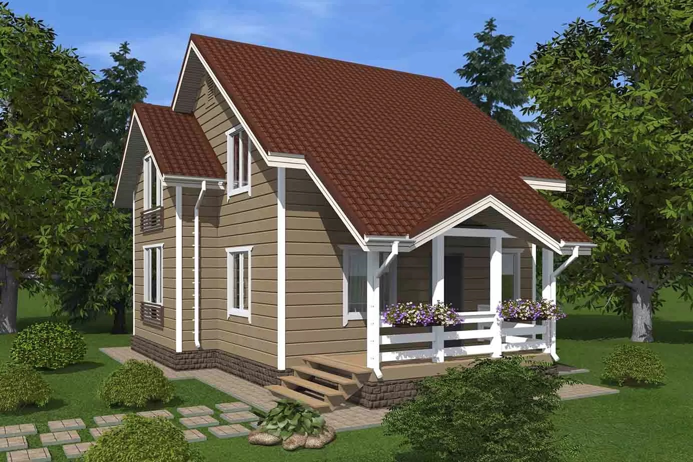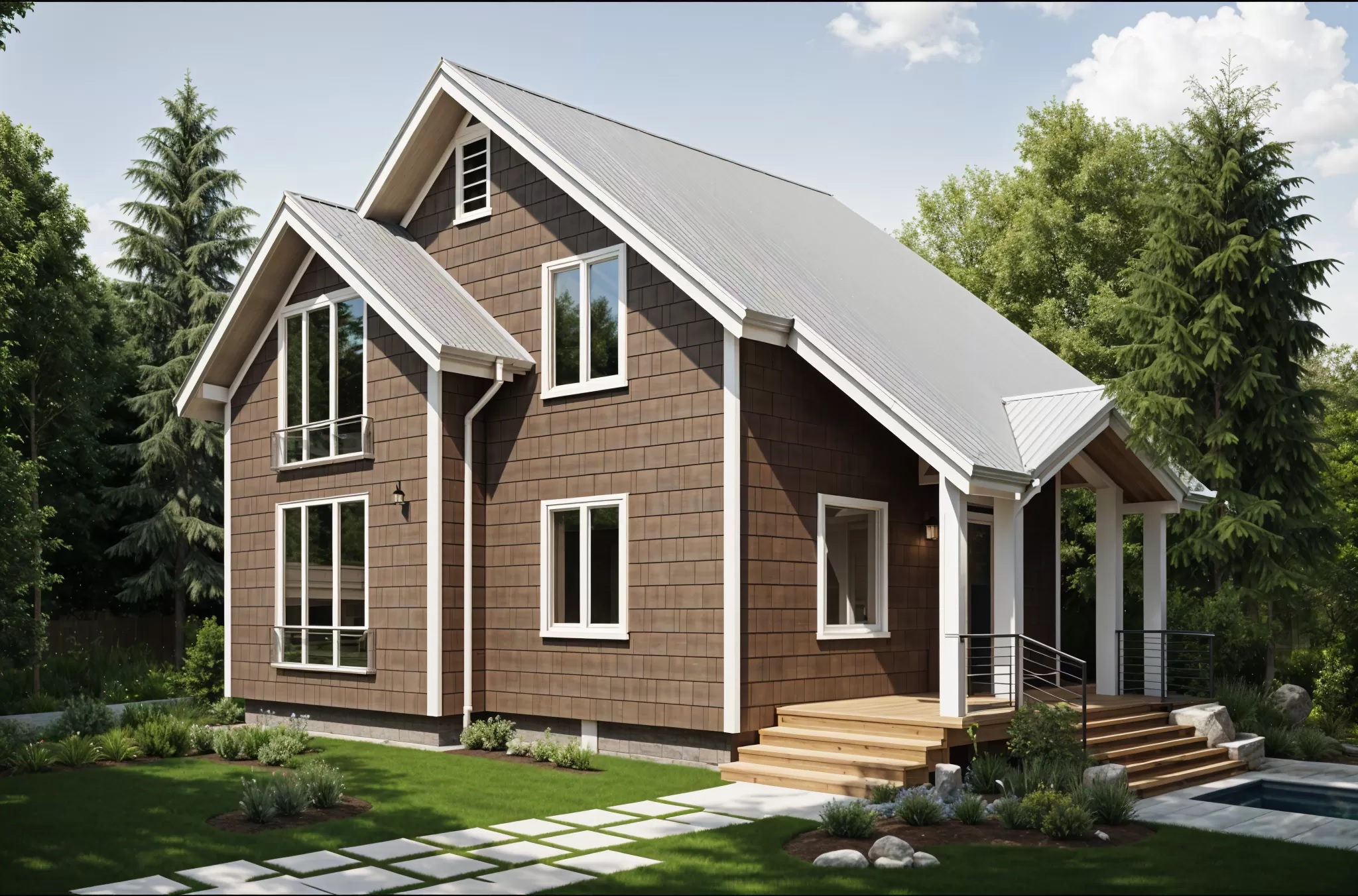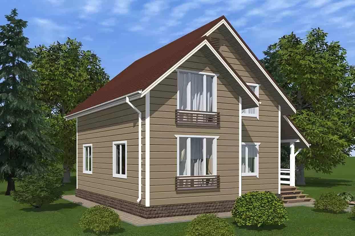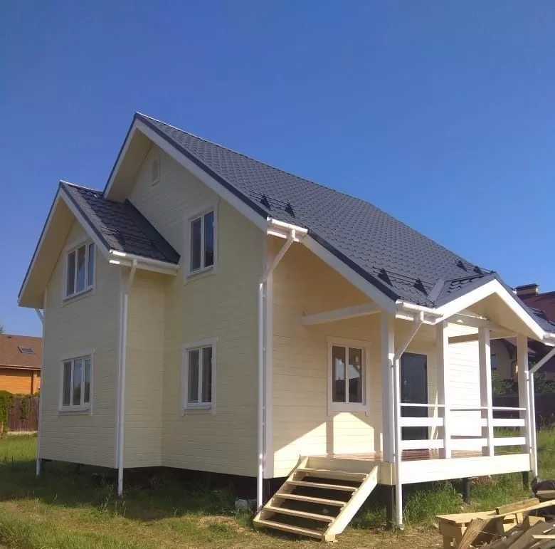 Современный двухэтажный дом с большими окнами, покатой темно-коричневой крышей, акцентами из дерева и камня и крытым крыльцом — идеальный пример каркасного дома в Московской области, окруженного деревьями и зеленью. Современный деревянный дом, построенный в стиле дома из клееного бруса, с большими окнами и темно-серой крышей стоит на травянистом участке. Небо пасмурное, на заднем плане видны соседние дома и деревья. Современный светло-коричневый деревянный дом с серой крышей и большим крытым крыльцом стоит на травянистой земле под частично пасмурным небом — отличный пример каркасных домов в Московской области. На заднем плане видны деревья и еще один дом. Современный двухэтажный каркасный дом с крутой двускатной крышей, большими окнами и крыльцом, возвышающийся на сваях, окруженный травой и частично пасмурным небом.
