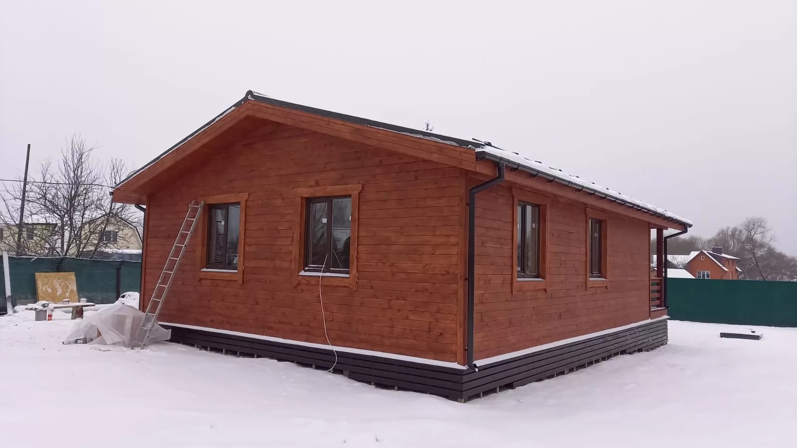 IMG 0199 IMG 0190 Деревянный домик, вдохновленный домом из клееного бруса, с большими стеклянными окнами и крытым крыльцом стоит в заснеженном лесу. С крыши свисают гирлянды, снег покрывает перила и землю в окружении высоких деревьев. Современный каркасный дом с большими окнами и крытым крыльцом расположился среди высоких сосен в заснеженном подмосковном лесу, создавая умиротворяющую зимнюю картину. Современный небольшой дом с большими стеклянными окнами, черным металлическим и деревянным сайдингом и крытым крыльцом с белыми перилами — идеальный пример каркасного дома в Московской области, расположенного в пышном, зеленом лесу.