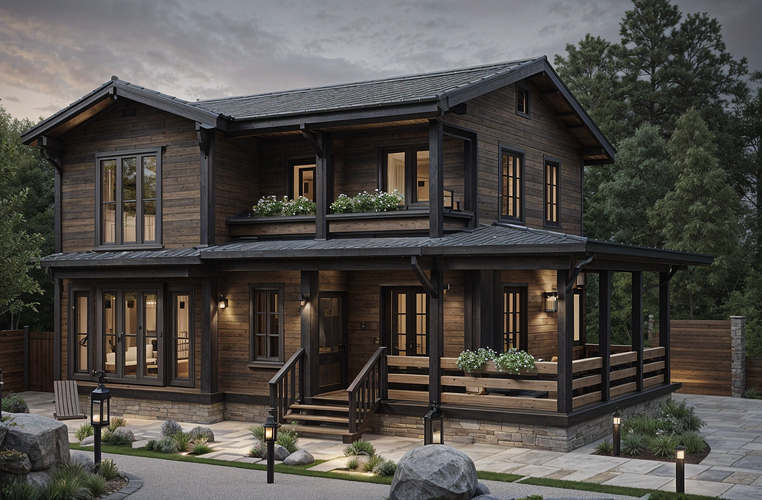 Загородная жизнь в таком доме становится полноценным образом жизни: вы сохраняете контакт с природой, ощущаете свежесть воздуха, а простор участка позволяет организовать зоны отдыха, сада или террасы. Натуральные материалы — дерево, камень, стекло — создают гармонию с ландшафтом и поддерживают ощущение единства с окружающей природой.